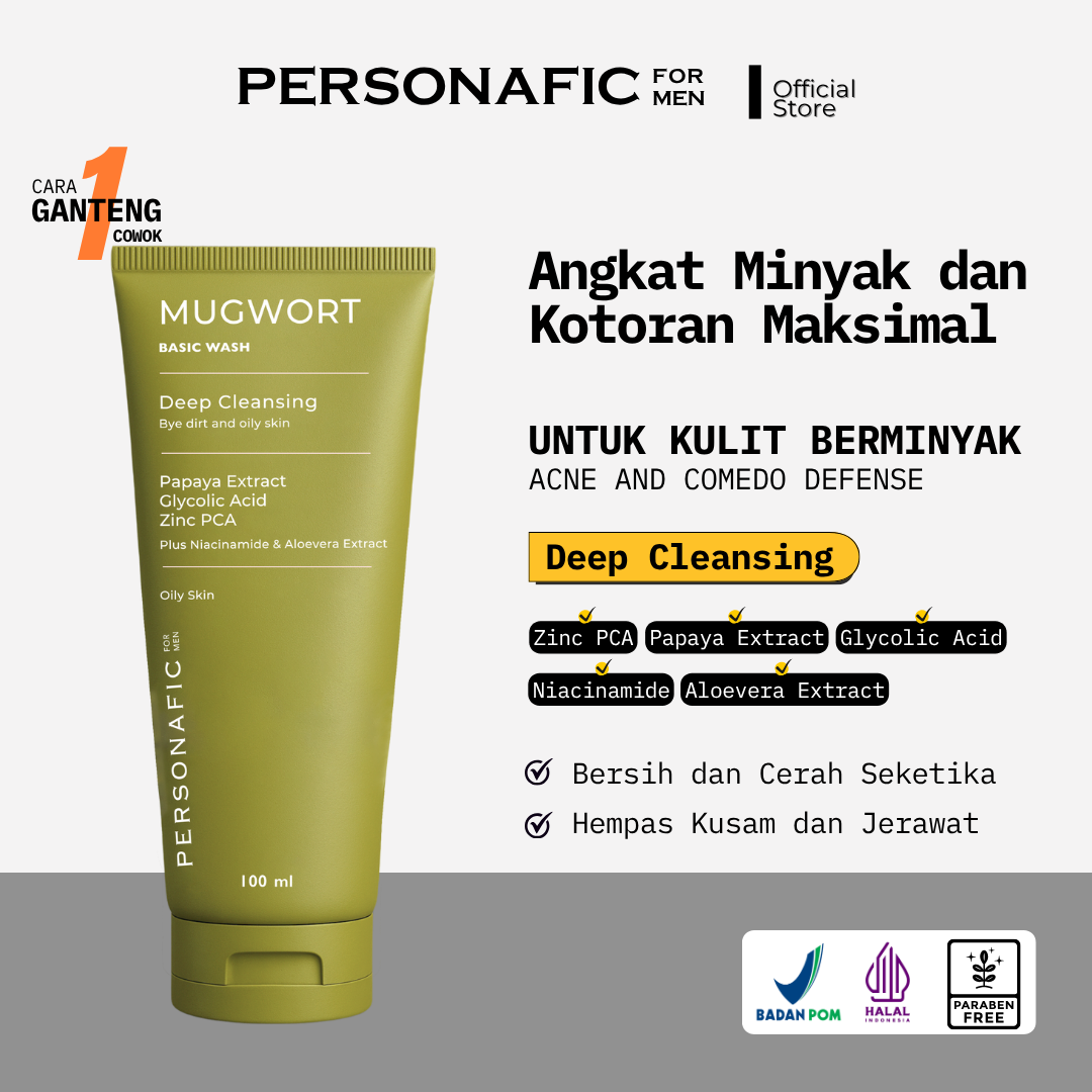 Facial wash dengan formula deep cleansing mampu membersihkan kotoran dan minyak lebih kuat dari cleanser biasanya. Sangat cocok digunakan untuk wajah dengan tipe kulit berminyak. Mugwort Basic Wash ini mengandung papaya extract, glycolic acid, zinc pca, niacinamide dan aloevera extract.
