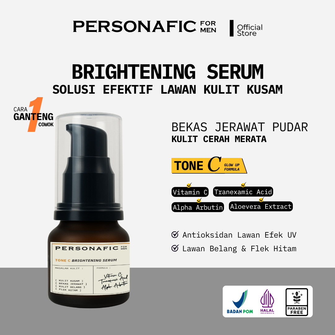 Serum pencerah wajah untuk pria yang udah tidak jerawatan, tapi masih kelihatan kusam dan punya bekas jerawat, noda hitam atau kulit belang. Dengan kombinasi Vitamin C, Tranexamic Acid 2%, dan Alpha Arbutin, serum ini bantu mencerahkan kulit, menyamarkan noda hitam, dan meratakan warna kulit tanpa bikin iritasi.