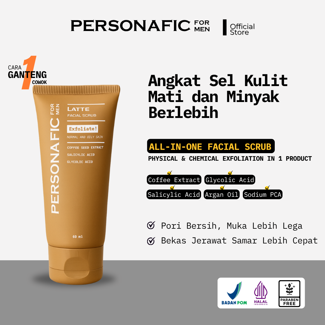 Latte Facial Scrub mengandung micro-beads yang lembut, terdiri dari walnut shell powder dan ekstrak kopi, untuk eksfoliasi sel kulit mati. Latte Facial Scrub juga mengandung glycolic acid & salicylic acid sebagai chemical exfoliant agent.